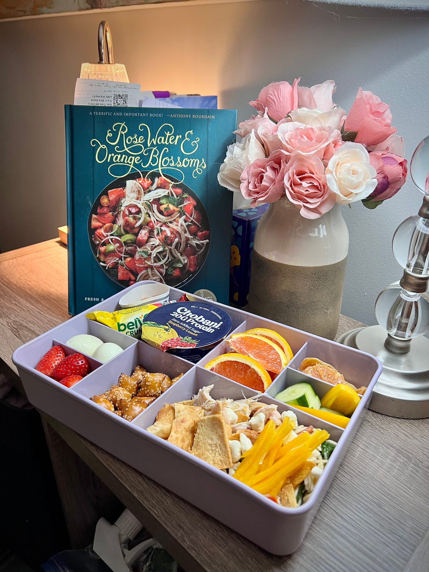 Lunch: Mediterranean Orzo Salad with Pita and Rotisserie Chicken (olives dutifully removed by husband). Soccer Style Sliced Oranges. Cucumber and Bell Peppers.